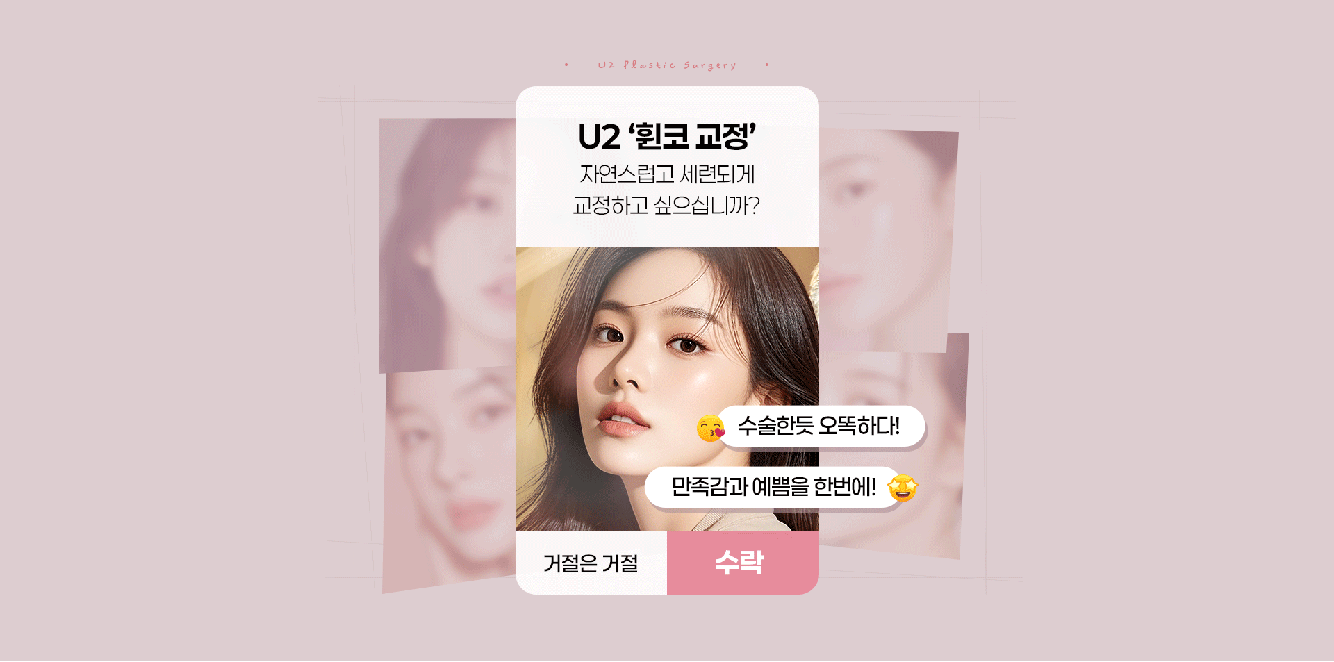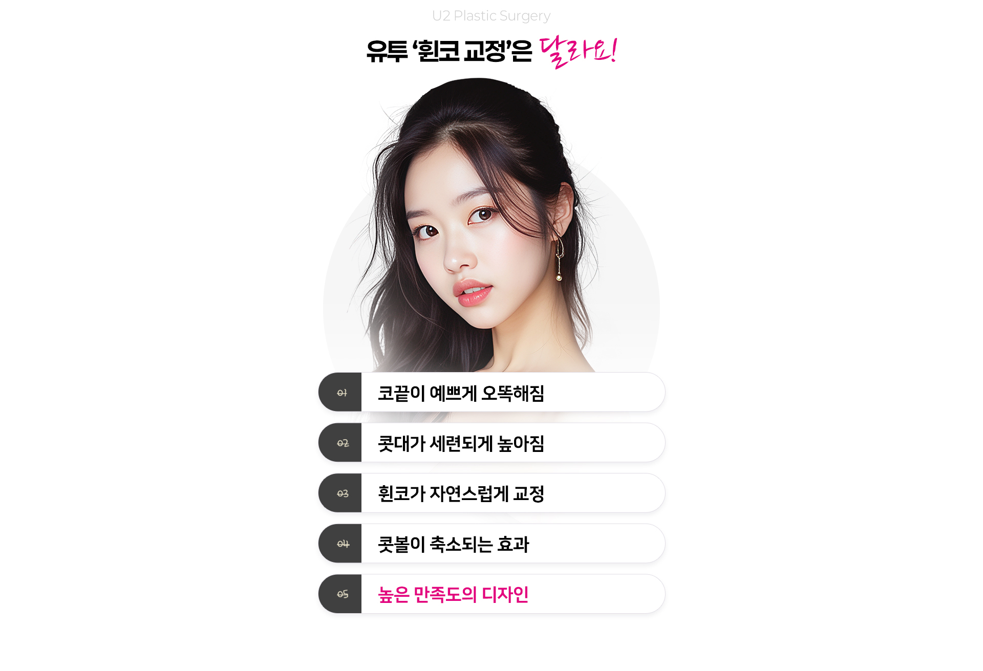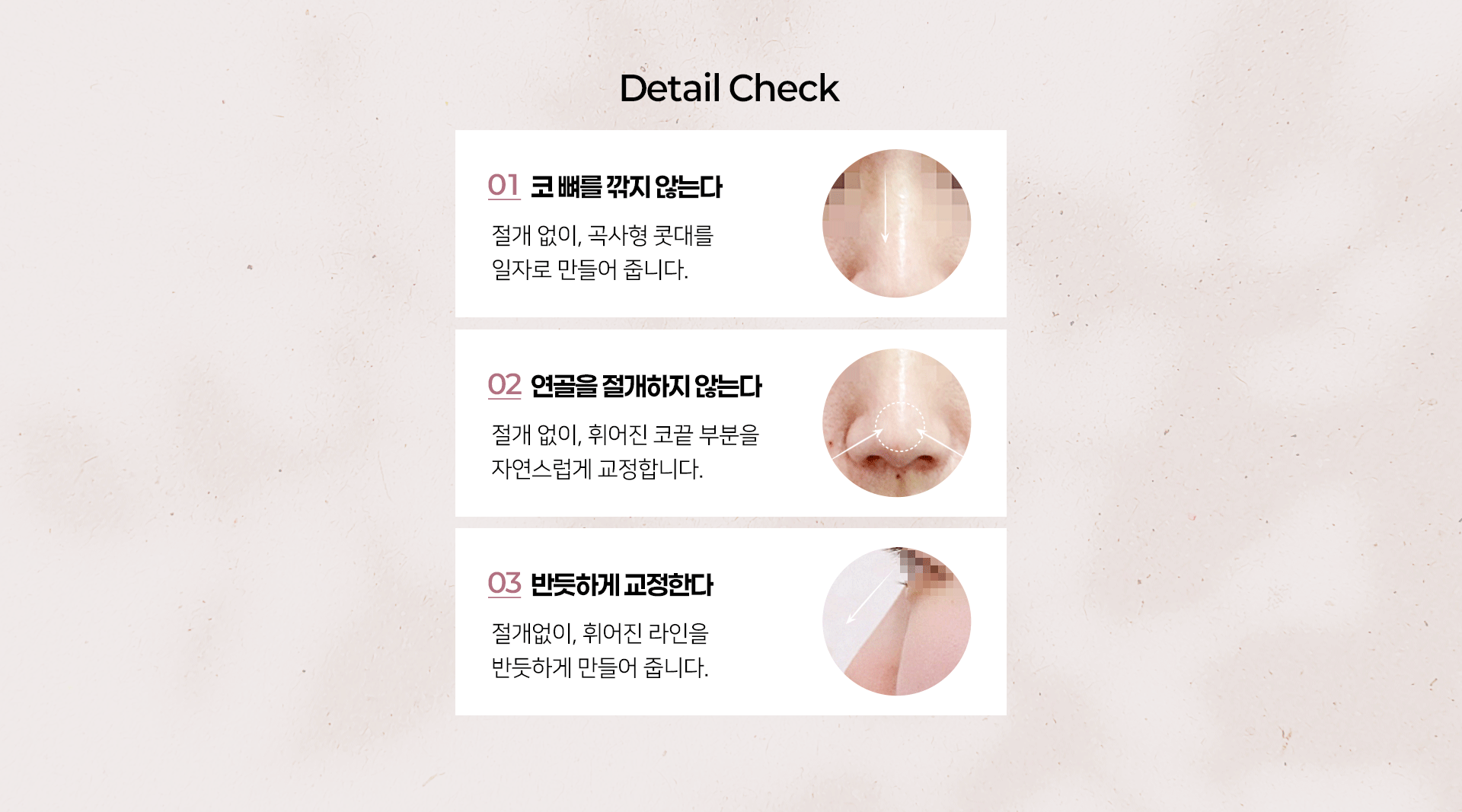 - 비절개 코 성형 후 입의 근육을 자주 사용하여 표정을 짓거나 입을 크게 벌리는 경우, 인중을 길게 하는 행동은 삼가해야 됩니다. (코끝 시술이 내려갈 수 있습니다.)